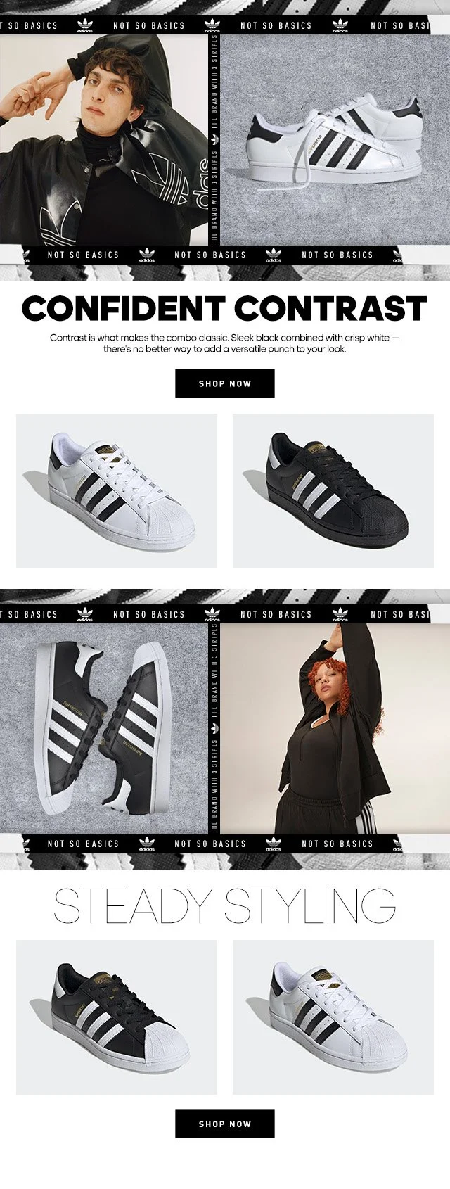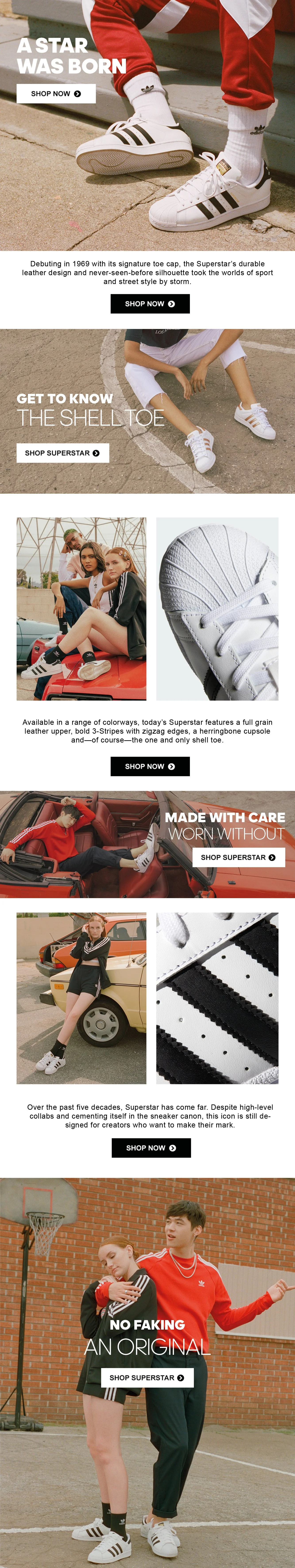 For the 50th anniversary of the Superstar, we showcased the sneaker’s unique styling options alongside key product details and historical notes for a balanced presentation fitting of the one-and-only shell toe.