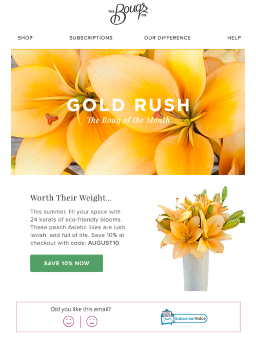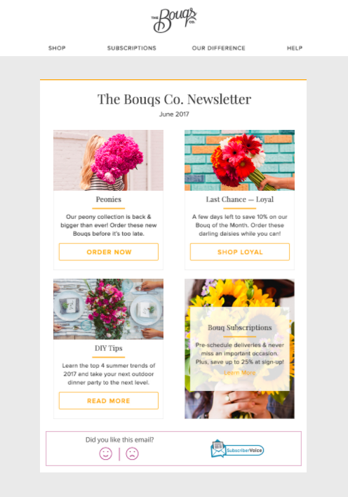 Monthly sends are consistent, but it can also be tough to keep things interesting. I’m pretty proud of the time and effort I put in to spice up the company’s regular emails—like this “Bouq of the Month” promotion—which gave me the chance to explore the product’s personality to build effective messaging.